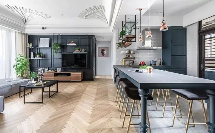 人字型鋪貼作為最經典的地板鋪貼方式,用在餐廳里帶著點藝術氣息,又帶著點人間煙火的味道,就像一道靚麗的風景線,讓你在吃飯的時候,還能享受視覺上的沖擊。
