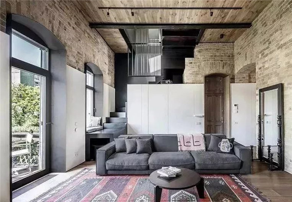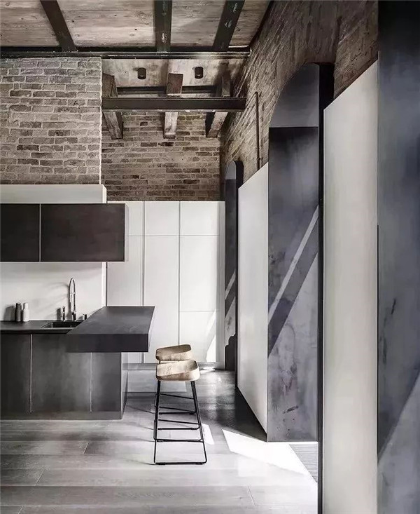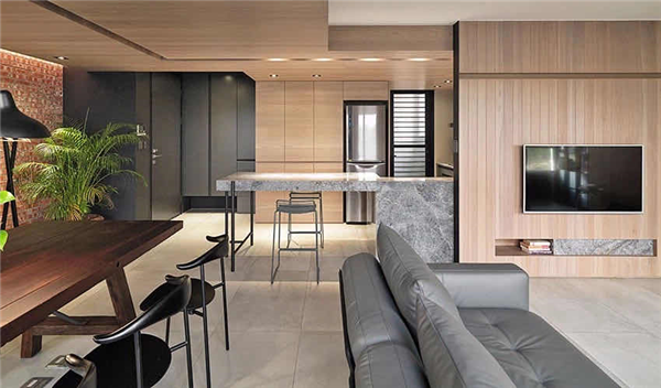 木色吊頂與灰磚的銜接