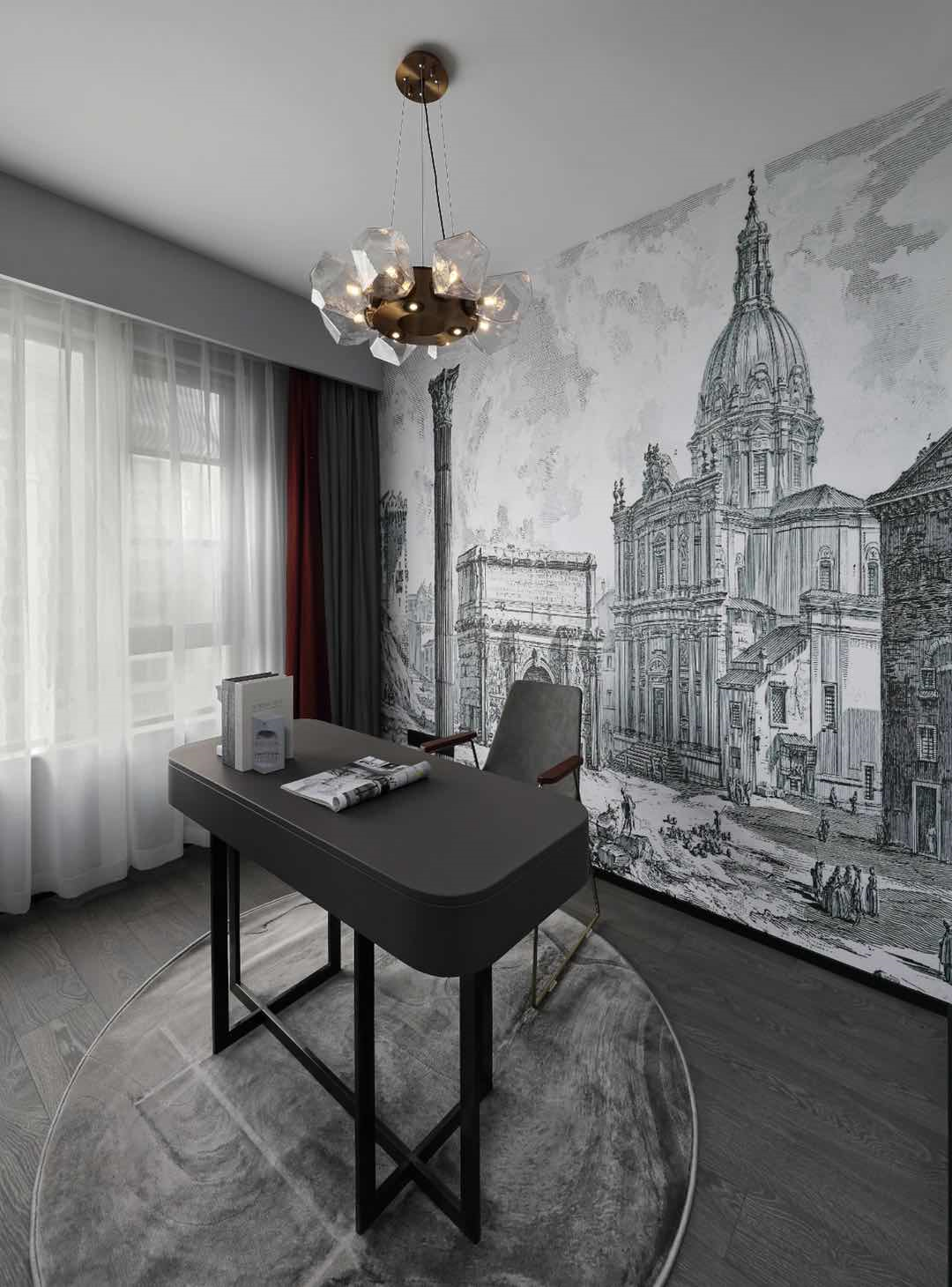 墻面是一幅黑白歐式建筑的街景圖案