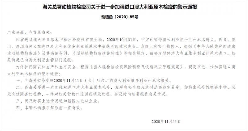 10月底,昆士蘭州原木對華出口被暫停,沒想到僅僅過了兩周,11月11日,中國海關總署又發布最新警示通報:決定暫停維多利亞州原木進口。