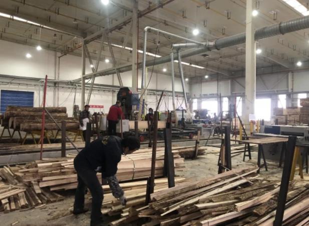 在進(jìn)口原木加工倉(cāng)庫(kù)內(nèi),幾名作業(yè)人員正將一塊原木段推進(jìn)木工機(jī)械內(nèi)對(duì)木頭段進(jìn)行切片作業(yè),切開(kāi)后的木塊再由小號(hào)的木工機(jī)械完成成品板材的切割,車間內(nèi)共有6條生產(chǎn)線同時(shí)開(kāi)工作業(yè),每條切割線均設(shè)有一條吸塵管道,將切割木材時(shí)所產(chǎn)生的鋸末吸干凈,車間內(nèi)呈現(xiàn)一片繁忙的景象。