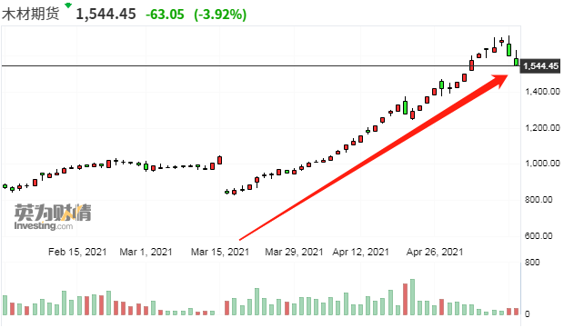 最近幾周,木材價格幾乎每天都在創新高,此前一度沖破每1000平方英尺1700美元,已經較一年前翻了兩番。截至5月12日,美國木材期貨價格報每1000平方英尺1544.45美元。
