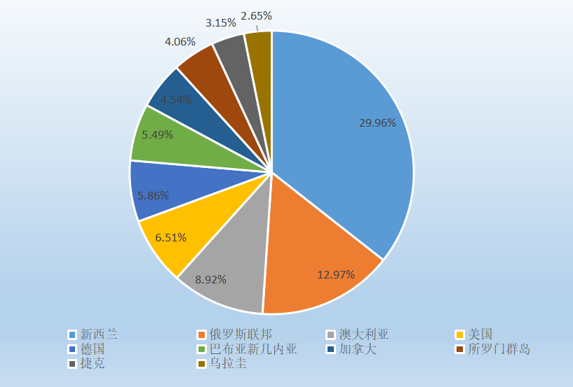 在2020年之前,國內針葉原木進口主要來自新西蘭、俄羅斯、澳大利亞、德國、美國和加拿大,來自上述六個國家的原木占據2019年國內進口原木總量的79.7%。