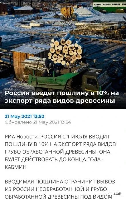 自俄羅斯去年9月宣布將于2022年停止出口未加工的原木材料后,今年5月俄羅斯政府新聞處(塔斯社)又傳來消息,俄政府同意自7月1日起至年底對多種粗加工木材出口征收10%的關稅。