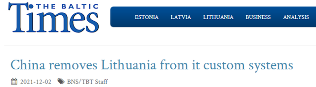 立陶宛國家廣播電視臺(LRT)等多家立媒和《波羅的海時報》2日消息稱,立陶宛出口商報告說,中國海關似乎已將立陶宛從其系統中移除,貨物無法在華清關。立陶宛外交部稱,正就此事與歐盟進行聯系。