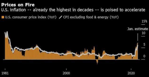 3、今晚,即北京時間周四(2月10日)晚間21:30,美國勞工部將公布1月消費者物價指數(CPI),此份數據將直觀呈現新年伊始美國物價水平的最新變化。目前,隨著人們對通脹高企的擔憂不斷加劇,美聯儲已經在1月議息會議上釋放了將在年內采取多次加息乃至啟動縮表的信號。目前,彭博社和路透社采訪的經濟學家調查中值均預計,美國1月CPI同比增速有望達到7.3%,續創1982年2月以來的40年高位。同時,1月CPI環比增速有望達到0.5%,與上月持平。