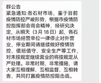 據(jù)福建衛(wèi)健委最新疫情通報(bào)的信息,3月21日0—24時(shí),福建110例,其中泉州市89例、莆田市16例、廈門市2例、漳州市2例、福州市1例;當(dāng)前泉州不少建材門店停止?fàn)I業(yè),水頭等地的石材市場關(guān)閉。